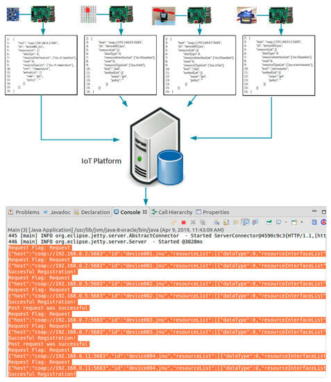 The IoT Platform includes the IoT server and database for the registration of IoT devices. The IoT platform is a high-performance device which has sufficient computing ability to communicate with the IoT DNS server and IoT devices. The database is used for saving the information of the IoT devices and sensing data that is collected from the environment. Figure 11 describes the implementation result of the IoT devices auto-registration to the IoT platform. The parameter values of the IoT devices are sent to the IoT Platform. The resource profile is based on a JSON format that is implemented in the Android Platform. When the IoT devices are connected to the IoT platform, the IoT devices send POST request with its parameters to the IoT Platform, and these parameters automatically register to the IoT platform. As can be seen, the parameters include host, id, resource models such as resource list, resource type list and method list of the IoT device. If we take the first IoT device as an example, this device’s “host”: “coap://192.168.0.2:5683” is described based on <host>:<port> method. <host> shows the name of the network or endpoint network, and <port> addresses network port number. Id describes device URL name “device001.jnu.” In the figure, we have four types of IoT devices and four of them have sent a POST registration request with their parameters. After that, every IoT device is registered automatically to the platform. When the IoT device auto-registration process finishes, the system shows a “Successful registration!” message.