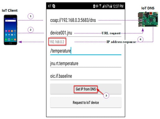Figure 12 shows the implementation result of the IP address discovering by the IoT client. The screenshot of our proposed system android application shows obtaining the IP address from IoT DNS. The process includes four main phases. Firstly, the IoT Client is connected to the IoT DNS server through coap://192.168.0.3:5683/dns. Secondly, for getting the IP address, the IoT client has to write a URI name (device001.jnu) to the address bar. Then the client can click Get IP from the DNS button to get the valuable IP address according to the URI name. In the last phase, the IoT DNS sends an acknowledgment with an IP address (192.168.0.2). If the IoT DNS server does not include the IP address requested by an IoT Client, the IoT DNS response with a “Not Found” message.