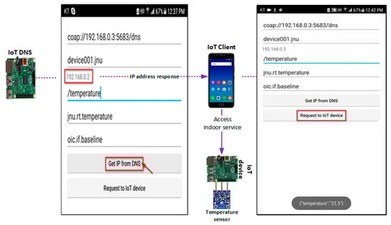 Figure 13 describes the implementation result of accessing the indoor service. It is clear that IoT client is connected to the local IoT DNS server with coap://192.168.0.3:5683/dns. The IoT client enters the URI name (device001.jnu) to the address bar and clicks “Get IP from DNS button.” After that, the IoT DNS server sends, in response, the IP address to the client (192.168.0.2). After getting tje IP address from the IoT DNS, the IoT client is able to connect with the IoT device which equips with a BME 280 and with “coap://192.168.0.2/temperature” request the client clicks the “Request to IoT device” button for accessing the temperature sensing service. Once the temperature sensing service is requested, then a temperature value is returned in JSON format.
