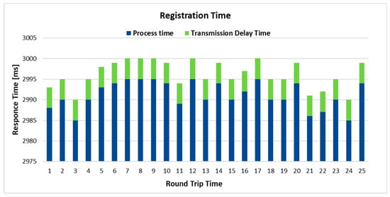 Figure 14 shows the evaluation results for the IoT device registration Round Trip Time (RTT). In this experiment, we present the evaluation results through the collection of RTT 25 times. The same hardware and network environment do the RTT for each registration. The RTT is collected in the IoT device through the time difference between the time for sending the registration request and the time for receiving the registration response. The results describe the RTTs are taken by between 2990 and 3000 ms, the average is 2996 ms, and the standard deviation is 3.3 ms. According to the results, IoT device registration takes about 3 s in our proposed system. The quantity of the latency for every device registration is approximately 5 ms, which compared to the average registration time latency is very low.