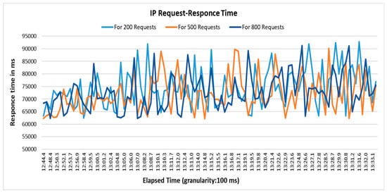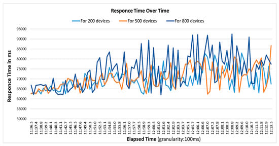 Figure 15 includes the comparison among three different numbers of IoT devices registrations in order to investigate the response time of the proposed system. When the new IoT device is connected to the home network, it sends an auto-registration POST request with IoT device’s parameters. We simulated for a period of 100 ms. In general, the response time increases as the number of users increase and querying the system at the same time. At the first round, we assume that 200 IoT devices sent the registration request to the IoT DNS server for auto-registration, 500 devices at the second round, and lastly, we evaluated the performance of implementation by increasing the number of IoT devices to 800. Figure 14 shows that when only one IoT device sends a registration request, registration takes approximately 2996 ms, but when 200 IoT devices send registration requests at the same time, it takes between 62,000 and 81,000 ms. The registration time of the system for the first two groups is nearly the same (in only one point the second group spends response time more than 8500 ms). However, when we increase the number of IoT devices to 800, the IoT devices registration time increases significantly compared to the other two groups. More precisely, after increasing the number of IoT devices to 800, registration time reaches 92,000 ms, which means as the number of the devices increases response time also increases.