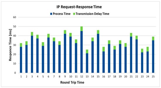 Figure 16 describes the evaluation results for the IP address request-IP address response process Round Trip Time (RTT). The evaluation results were tested through the collection of RTT 25 times. Our proposed system’s application interface shows the connected available IoT DNS server (coap://192.168.0.3:5683/dns). In order to get the IP address from the IoT DNS server, the client sends a request with the URL name and clicks “Get IP address” button from the Android application and the IoT DNS server sends a response with the IP address of the IoT device, this process which is sending a request and taking response IoT DNS server are described in 1 RTT. The same hardware and network environment are used to the RTT of each request and response. The results illustrate the RTTs are between a minimum of 25 ms and the maximum 49 ms, the average RTT is 37 ms, and the standard deviation is 6.9 ms.