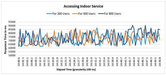For accessing indoor service evaluation performance, we ran the simulation three times according to three various user groups in the 100 ms period. As can be seen from Figure 19, as the amount of the users increase the response time also increases in the proposed system. When 200 users send a request for accessing the indoor service at the same time, minimum and maximum response time is between 61,000 ms, and it is more than 85,000 ms (in only one point), respectively. When user numbers are equal to 500, the response time also increases a little bit. However, it is difficult to make a comparison between the first and the second groups, because the system response time for the first two groups is almost the same. Only in some points, the second group is closer to the 8500 ms response time. The third group simulation results are higher than the other two groups when 800 users send the GET request for checking indoor temperature. With the CoAP network protocol, it takes more than 85,000 ms in some points. However, in some other points, response times are nearly similar to the other two groups.
