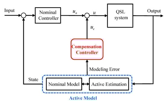 A quadrotor carrying a cable-suspended load is usually called a quadrotor slung load (QSL) system. There are distinct advantages for using a QSL system to transport cargos [1,2,3]. A QSL system can freely pass complex terrains and access the locations which are hard for the ground vehicle transportation. Also, the QSL system has better tolerance with respect to the shape and size of the cargo, while the suspended cargo can be easily loaded and unloaded even without landing the quadrotor. However, in spite of the benefits the QSL system could provide, the swing load will seriously influence the dynamics of the QSL system [4] and increase its degrees of freedom [5]. The dynamics of a QSL system are strongly nonlinear, coupled, and underactuated, remaining many challenging problems in the controller design [1,2,3,4,5]. Generally, there are two ways to improve the performance of a QSL system, namely: (1) trying to construct a more accurate model that meets the QSL dynamics so that the controller can use it to compensate the complex dynamics; and (2) designing a controller that could reject the unmodeled uncertainties effectively, while achieving good control performance at the same time.