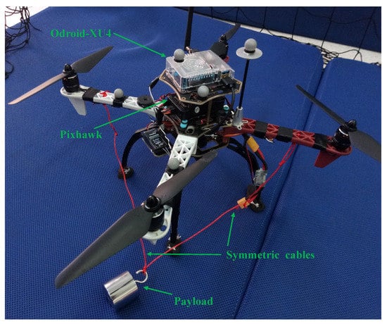 Recently, extensive studies have been carried out for modeling the QSL system [4,5,6,7,8,9,10,11,12,13]. Researchers used Euler–Lagrange method [6,7], Udwadia-Kalaba Equations [8,9], Newton-Euler method [10] and Kane’s method [11], to model the QSL system. For examples, in [4], the QSL dynamics were described as a second-order Euler–Lagrange model while ignoring the aerodynamic effects. In [12], a planar scenario was considered by using Euler–Lagrange method. Theoretically, we probably could obtain a high-fidelity model if the load of the QSL system and its motion states were exactly known. However, in most of the real applications, either the motion of the load or its influence to the aerodynamics is time-varying and unknown.