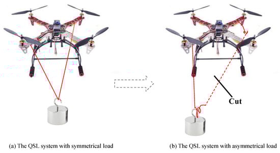 The experimental scenario. (a) The quadrotor slung load (QSL) system with symmetrical load; (b) The QSL system with asymmetrical load.