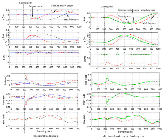 There are 3 plots in each of the figures of Figure 4a which are, respectively, the desired value, the measurements of the quadrotor motion state, and the nominal model outputs. We can see that the nominal model outputs meet the measurements well before the cut occurring, which indicates that the offline-identified model matched the quadrotor well in the hovering state. After the cutting, the nominal model outputs deviate significantly from the corresponding measurements, which means the model can not describe the load change. Therefore, the real measurements of the quadrotor bias the desire values significantly, which means the quadrotor vibrates clearly after the abrupt change of the load.