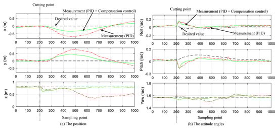 While are the motion states under the “normal PID control” and the “enhanced PID control” respectively, and is the corresponding measurement, the average errors of Equation (26) are listed in Table 2. We can see that after the active-modeling-error-based enhancement, the position tracking errors caused by the abrupt load change have been rejected more than 40%, and the attitude errors more than 27%, while being compared with the normal PID control.