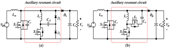Figure 1a shows a conventional resonant ZVT boost converter. Its auxiliary circuit is composed of a boost converter, an auxiliary switch, a resonant inductor, two resonant capacitors, and two diodes. The resonant capacitor is discharged before the current flows through the body diode. These resonant components make a partial resonant path for the main switch to perform soft switching under the ZVT, using the resonant circuit [15]. However, the freewheeling period of the resonant inductor current causes a conduction loss of the diode and resonant inductor. This causes a reduction in the whole system’s efficiency.