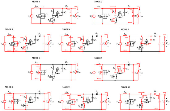 The following statements are assumptions for simple analysis of the proposed converter: First, all switching devices and passive elements (inductor and capacitor) are ideal. Second, the input voltage 200 V and output voltage 380 V are constant. Third, the recovery time of all diodes is ignored. The resonant ZVT boost converters operate in 10 different modes, and the following assumptions were made for a steady-state analysis: