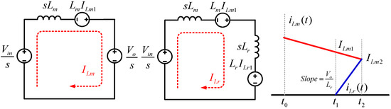 At the end of Mode 3, the resonant capacitor Cr is equal to zero. The resonant capacitor voltage vCr and resonant inductor current iLr can be obtained by the Laplace transform, following Equations (9), (10), (12), and (13). In addition, the resonant impedance Zr and angular frequency ωr are given by Equation (16). Additionally, iLm, iLr, vCa, and vCr are defined by Equations (8), (11), (14), and (15).