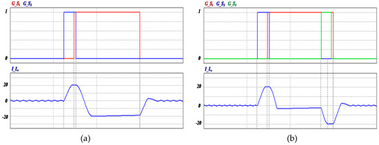 The current conduction period of the proposed converter is shorter than the conventional converter. The waveforms of the voltage and current of each switch are shown in Figure 16. The soft switching operations of each switch were successfully performed, as shown in Figure 16b. It also shows some voltage ringing, due to the resonance between the auxiliary switches S2 and S3. The switch used in the simulation is non-ideal, and the parasitic capacitances may cause a switch failure. Specifically, the output capacitance resonates with the resonance inductor and leads to ringing. These resonances may cause the current or voltage stress on the devices and finally increase the voltage rating of the devices.
