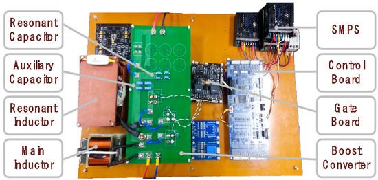 In order to prove the theoretical analysis, experiments were conducted on the proposed ZVT boost converter in Figure 18. It consists of a boost converter, a controller, and a gate driver. The controller used in this experiment was the DSP TMS320F28335 from TI.