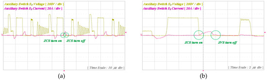 Figure 22 shows the waveforms for the voltage and current across the auxiliary switch S3. The body diode of the main switch is turned on under a zero-voltage switching condition. Afterwards, the auxiliary switch S3 is turned on under the ZCS condition because of the resonant inductor Lr and auxiliary capacitor Ca. Then, voltage of the auxiliary switch S3 remains at zero. Figure 22b shows the extension of soft-switching for the auxiliary switch S3. Voltage ringing occurs due to the resonance between the auxiliary switches S2 and S3. The switch used in the simulation is non-ideal, and the parasitic capacitances may cause a switch failure. Specifically, the output capacitance resonates with the resonance inductor and leads to ringing.