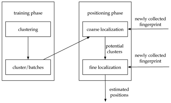 A commonly seen WLAN positioning framework considering the mentioned two factors is to cluster in the training phase and to partition the positioning phase into coarse localization and fine localization. The framework can also be denoted as hierarchical positioning. As shown in