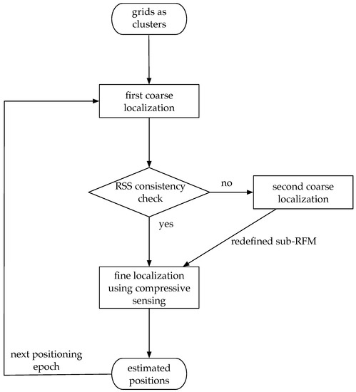 10]. This is due to the fact that the second coarse localization phase is added if the RSS consistency check is not passed. The positioning is degenerating to the situation where the mentioned prior information is not available. This is different from the strategy in [