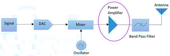 The PA is the key component of RF transmitters. An RF transmitter is composed of functional blocks, such as a digital-to-analog converter (DAC), an up-conversion mixer, an oscillator, a PA, and a band pass filter (BPF), [11,12,13], as shown in Figure 1. Among all of these modules, the PA is the most vital block because its performance significantly affects the overall performance of the transmitter [14,15,16]. The PA can be defined as an electronic amplifier that converts a low-power RF signal into a high-power RF signal [1]. The PA receives the RF signal from the mixer and then sends it to the antenna after amplifying and passing it through the band pass filter [17,18,19]. In addition, the PA reduces the voltage swing to obtain a higher output power according to the system’s requirement.