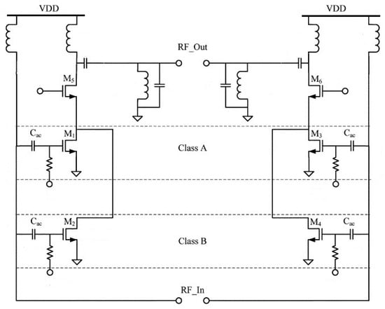 Ding and Harjani (2005) proposed a general cascode parallel class-AB CMOS PA by integrating a linear power control technique, as shown in Figure 3 [33]. In this design, two amplifiers operate in parallel to improve the dynamic range and power efficiency. The input transistor M1 was biased with a fixed voltage of 1.2 V. The cascode configuration was formed by the CS transistors M1, M2, M3, and M4, and the CG transistors M5 and M6. The CS transistors form the transconductance of the class-A and the class-B PAs in order to provide more linear transconductance, which led to high power gain of 12 dB. At low input levels, the class-A amplifier contributed the majority of the gain, and the class B amplifier had a very low gain. As the input level increased, the gain of the class- B amplifier increased, and its contribution to the overall gain increased proportionately. The outputs from both amplifiers were combined in the current domain with a slight overhead, thereby producing an improved isolation property and high power efficiency of 44%. AC coupling capacitors and the matching network were used for the output impedance matching [33].