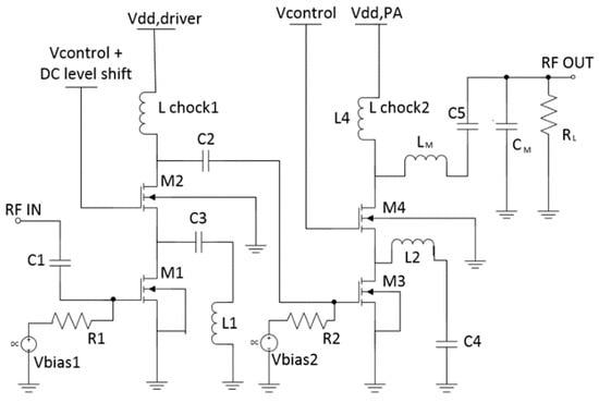 Bameri et al. (2011) proposed another general cascode class-E PA that utilized an advanced linear power control technique, as shown in Figure 6 [16]. The gate voltage of the transistor M4 was used to control the voltage of the output power. The significant improvement offered by this design was the wide power control range of 155 dB from −136 dBm to +19 dBm. However, this design suffered from a low output power because the output power was reduced as the control voltage was decreased. The reduced output power operates the PA from a switching mode to a linear mode, thereby producing a higher slope of AM-AM characteristic for the cascode power control technique. At high control voltage levels, the driver output power also increased. An increase in the driver output power reduced the Ron, thereby increasing its PAE and gain.