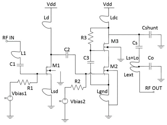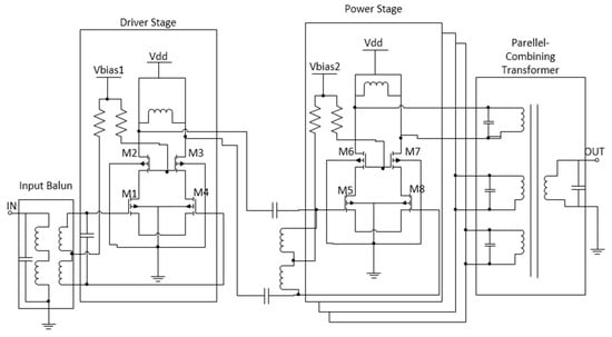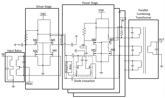 Figure 2 describes the basic block diagram of the CMOS PA. The block diagram consists of two main stages, namely, the driver and power stages. Both stages are biased with individual bias voltages. Different configurations are applied to the driver and power stages to operate the PA properly [20,21,22,23]. Input and output matching networks are used to minimize the return losses to obtain a high gain and output power. However, inter-stage matching is also required between the driver and power stages.
