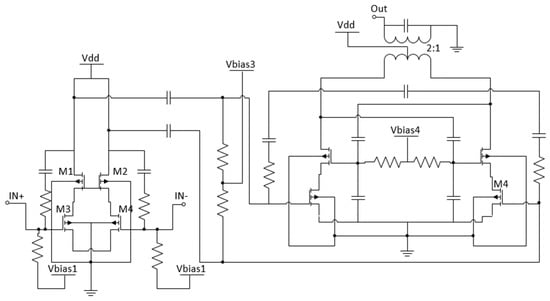 Hong et al. (2010) introduced a new self-biased cascode PA design with a capacitive cross-coupling technique, as shown in Figure 10 [38]. The first amplifier stage employed a general cascode class-A PA, whereas the second stage implemented a self-biased cascode class-AB PA. Given that thick gate-oxide transistors were used, the large size of the transistors resulted in a large gate-drain capacitance. Capacitive cross-coupling was implemented to decrease the gate-drain capacitance and the layout area of the bypass capacitance. Thus, the PA covered a small chip area of 1.0 mm × 1.6 mm and improved the reverse isolation. A transformer was integrated at the output to improve the output power. The transformer had a turn ratio of 2:1, which reduced the output impedance from 50 Ω to 12.5 Ω. At a supply voltage of 3.3 V, the PA achieved a 34.3% maximum PAE, a 25.2 dBm output power, and a 26.5 dB power gain [38].