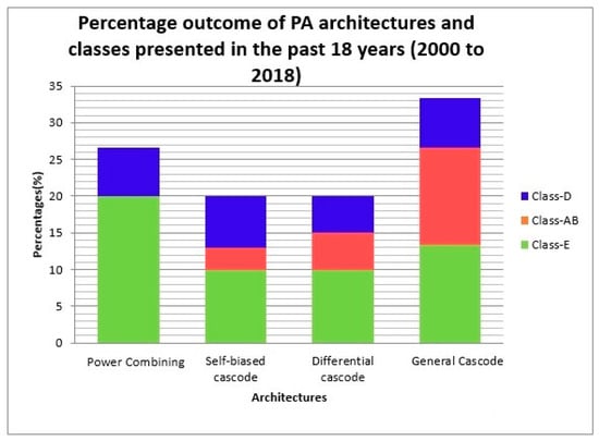 Different architectures have been proposed to satisfy the desired performance of the PA. The pie chart and bar graph in Figure 17 and Figure 18, which have been generated from the literature considered for this study, present the outcomes of the PA design architectures and classes in state-of-the-art works in the past 18 years (2000 to 2018). The plotted graph shows that the dominant choice is the general cascode architecture, which accounts for 33.33% of the overall PA design architectures. Compared with the rest, this type of architecture produces a higher power-added efficiency and a higher power gain at a lower power consumption. The second most dominant choice is the power combining architecture, which accounts for 26.67% of the overall design architectures. This architecture is characterized by a high output power and balanced parameter values. Both the self-biased and differential cascode architectures have the lowest percentage coverage of 20%. Among all classes of PA, class-E biasing has the highest percentage coverage of 53.33%. The high PAE allows the extensive integration of that class in the PA design. Class-D biasing has the second highest coverage of 25.34%, whereas class-AB biasing has the lowest coverage of 21.33%.