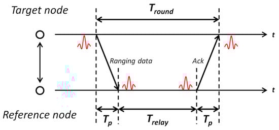 where denotes the one-way signal propagation time between the target node and the reference node, represents the ranging data processing time of the reference node and denotes the two-way spread time of the impulse. The round trip ranging algorithm is adopted in IEEE 802.15.4a standard, which is an international standard of high accuracy localization technology for wireless sensor network applications.
