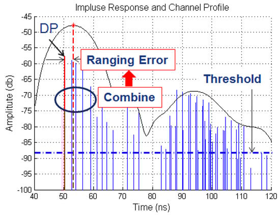 The TOA ranging error mainly comes from the hardware () and the multipath channel condition. Furthermore, in an indoor environment, the main error source is pulse shift error caused by multipath condition. As shown in Figure 2, the line of sight (LOS) transmission and non-line of sight (NLOS) transmission are two typical scenarios for indoor TOA ranging applications. Therefore, the signal error for TOA ranging can be considered as the multipath error and UDP (undetectable direct path []) error: