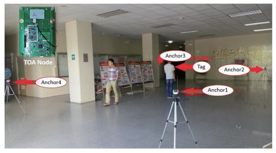 A practical indoor positioning system based on the UWB-TOA, developed based on DW1000, have been applied to perform the field testing. The experiment scene was shown in Figure 4, which is located in the hall (10 m × 17 m × 4 m) inside the building of School of Computer and Communication Engineering, University of Science and Technology Beijing (USTB). Four reference nodes are respectively located as , , and . The experimenter is asked to periodically walk along a rectangular trajectory within the region. In the experiment, we have used the TOA node in our localization system, which consists of a 32-bit RISC processor (STM32F103) and an on-board UWB module DWM1000. The experimenter holds the TOA node in hand. Thus, the NLOS condition was mainly resulted from the human body and the obstacle between the target node and the base stations. Empirical measurements have been conducted in the test filed, and totally 1549 times of localization were conducted. During the whole experiment process, about 6196 items of estimated distances are collected, and 1549 items of coordinates are derived to satisfy the ranging and localization accuracy.
