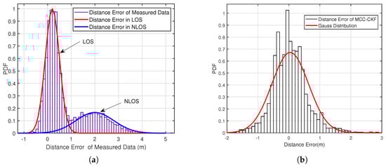 The PDF (probability distribution function) of TOA ranging errors in practical use case. (a) PDF of original estimated distances. (b) PDF of MCC-CKF enhanced distance.