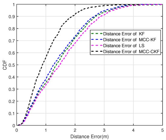 Kalman filter (KF) is one of the most useful tools to observe linear dynamic systems. The TOA ranging accuracy can be improved by smoothing TOA ranging results to mitigate the impact of the NLOS propagation []. However, in practice, TOA ranging is more affected by non-Gaussian noises rather than Gaussian ones, whose errors could achieve as high as 10 m [,]. If the system is disturbed by non-Gaussian noise, such as this mismatch, the performance of Kalman filter will be degraded, which has no ability to limit the large ranging error. Because when the noise is non-Gaussian, Kalman filter cannot take advantage of the high-order information of process and measurement noise.