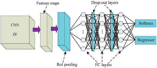 Second, the ZF net was improved for the Fast R-CNN. The last maximum pooling layer was replaced by a region of interest (RoI) pooling layer. To prevent over-fitting during training, drop-out layers with a threshold of 0.5 were added in-between fully connected layers. The depth value of the final fully connection layers was changed to five (four types of defects and a background) to ensure compatibility. Finally, the softmax layer was replaced by the softmax layer and the regress regression layer (see