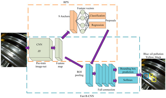 33], and therefore this paper adopts the ZF net. In order to make the method adapt to multi-class defects detection for wheel hubs, we made the following improvements for ZF net. Firstly, we improved the original ZF net for the RPN. The last maximum pooling layer and full connection layer of ZF net were replaced by a sliding convolution layer, then a full connection layer with a depth of 256 was connected, and its softmax layer was replaced by a softmax layer and regression layer, which was