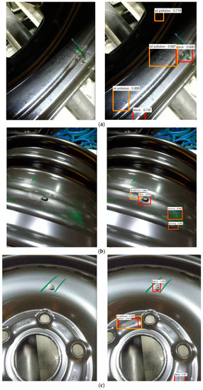 In order to better understand how the improved Faster R-CNN implemented the defect detection of the wheel hub, six additional test images were investigated. These images were taken in the same shooting environment. To ensure similar detection accuracies as those in case 3, each image size was 1080 × 1440 pixels. The images and their detection accuracies are shown in Figure 11. The grinning defect had a high detection rate, while the oil pollution defect showed a relatively low detection rate.
