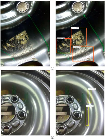 In order to annotate the images (defect types and coordinates of the bounding box), a Python code was used to manually label the image. During the labeling process, 4554 targets were marked out from 2,412 images (examples can be seen in Figure 4). It is worth noting that the scratch defect was carried by the raw material itself or produced by scratching with a sharp object during the processing. Oil pollution defects are formed when the oil falls on the surface of the wheel hub. The coarse agglomeration on the surface of paint was called a block defect. Due to the imperfection of coating technology, some areas on the surface of the hub can be unpainted, forming a defect called grinning.
