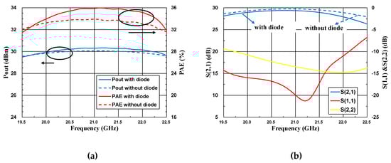 Two-tone measurement of the amplifier has been performed with 10 MHz tone spacing under the drain voltage of 5 V and gate voltage of −0.8 V. The intermodulation distortion was measured on a wafer with 10 MHz two-tone spacing. The two carrier sources were connected to the chip through a power combiner with an isolator in order to reduce the intermodulation contributions of the setup. As shown in Figure 15, IMD3 better than 20 dBc and PAE higher than 33% were measured at an output power of 27 dBm per carrier over a 20–22 GHz band. Compared to the design without an inner paralleled diode configuration, there is more than a 5dB improvement of IMD3. Table 4 summarizes the performance comparison of this work with other published linear amplifiers working in close frequency ranges. The characteristics of the amplifier, including power, gain, efficiency, and IMD3, are better than the previously reported ones.