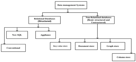NoSQL databases have no structured query language interface [4]: the syntax of queries varies from database to database. NoSQL databases lie in the spectrum between ACID and BASE (Basically Available, Soft state, and Eventually consistent) [5]. The NoSQL databases can distribute and replicate data over multiple servers [6]. NoSQL databases are the only databases that allow data distribution and persistency across different computing nodes [7]. NoSQL databases are categorized based on their storage type, key-value store, column store, document store, and graph store [6,7,8]. Initially, the term NoSQL stood for “No SQL”, but it has recently been redefined as “Not only SQL”, meaning that the system complements the relational database management system [9,10]. Relational and non-relational databases have their own data models, as shown in Figure 1.