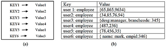 KVS databases are currently the main area of research due to persistent growth in data. Cloud environments and the Web 2.0 service rely on KVSs because of its exceptional features and easy adoption [20]. These databases use entirely different mechanisms of data storage and retrieval compared to relational databases [8,21]. KVS manages the unstructured data as a value of arbitrary length, which is associated with the unique key [22]; its data model and data are shown in Figure 2. These are high-performance databases, since the values are stored as an opaque BLOB (Binary Large Object). The BLOB is stored as a single entity in a database that is a collection of binary data that does not need to index data.