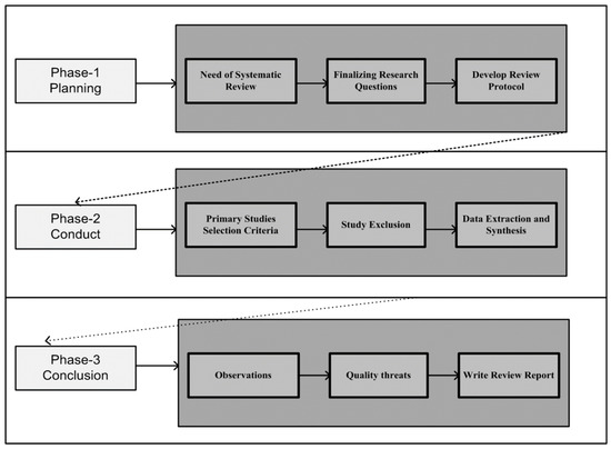 Brereton et al. described the process of a systematic review study that has three main phases: review planning, conduction, and the documentation of results as conclusion [31], as shown in Figure 3. The first phase highlights the purpose of this review, which is described in Section 1.1 and Section 1.2. The targeted research questions are presented in Section 3.1, and the process of selection of primary studies discussed in Section 3.4. Section 3.5 describes the inclusion and exclusion criterion. The detail of data extraction and synthesis is given in Section 3.6. Finally, the results of the study are documented in Section 4.
