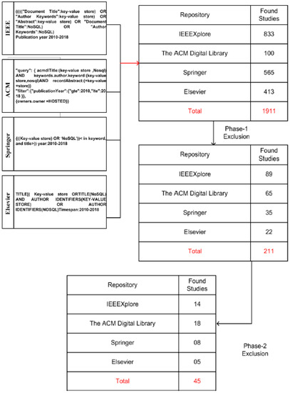 Previously, the KVS databases were used with many different objectives in different data-intensive applications. At the same time, these are also used for big data management and cloud computing, which may have different objectives other than the topic of the study. The focus of this SLR is to identify the challenges related to quality attributes, and investigate the techniques and methods that were proposed by the researchers to address these challenges. Thus, it is required to set some parameters for the selection of the most relevant studies. Here, the inclusion and exclusion criteria is defined and explained to select the most relevant primary studies, and the whole study selection process is also explained here as well. We searched through selected databases using our search query as mentioned below. Consequently, 1911 prospective studies were found from 2010 to 2018 after eliminating duplication. For selection of studies of this SLR, we followed a two-phase process as shown in Figure 4, and each phase has sub-phases. In the first phase, we follow the following criteria for the selection of study: