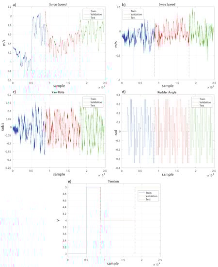 Training (blue), validation (red) and test (green) sets: (a) surge speed, (b) sway speed, (c) yaw rate, (d) rudder angle, and (e) tension of the motor.