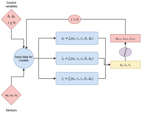 where  are the surge speed, sway speed and yaw rate, respectively;  is the rudder angle and  is the tension applied to the motor. The measurements at time step t are used to compute the accelerations and then, to predict the outputs at time step . As mentioned above, the target variables to model are the differential equations of the speeds, . These accelerations are computed as the discrete time derivative of the speed variables from raw data (Equation (4)):