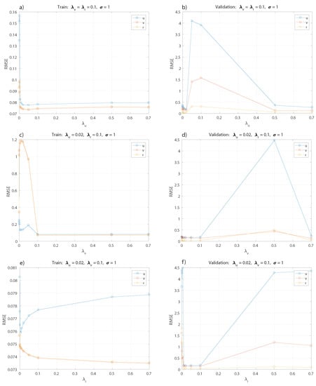 Therefore, a second approach has been used. The ,  and  parameters and ,  and  hyperparameters selection has been carried out training the three models together by means of an exhaustive grid search. Training data are used to optimize our cost function and compute our model parameters  given specific values of the kernel hyperparameters and s parameters. These specific parameters are computed as follows: first, a quick search was done to evaluate the range of the parameters where models show a coherent behaviour, i.e., low values for RMSE. Then, an exhaustive grid search for each parameter is performed by fixing the rest of the parameters at the values obtained in the previous process, as shown in Figure 5 and Figure 6. Each model obtained in this search is validated using the validation set, and the parameter values with the best performance are selected. Figure 5a,b show the selection of  keeping fixed the rest of the parameters for the training and validation set. The best value obtained is , then this parameter is kept fixed for tuning the others in the following optimization of  and  in Figure 5c,d and Figure 5e,f respectively.