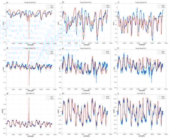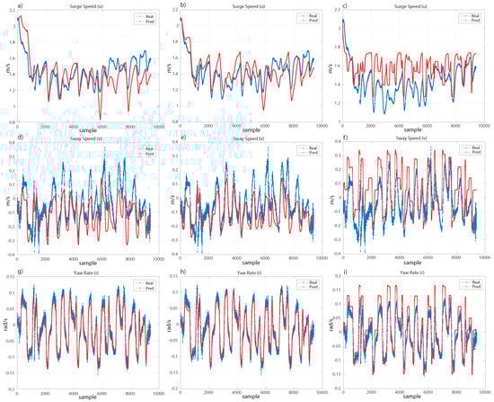 Validation set for the best models with the polynomial kernel (a) surge speed, (d) sway speed, (g) yaw rate; SR (b) surge speed, (e) sway speed, (h) yaw rate; and SOA-SR (c) surge speed, (f) sway speed, (i) yaw rate.