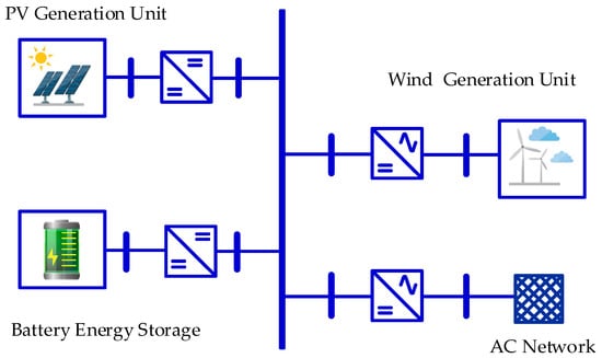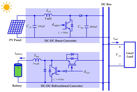 To better investigate the effectiveness of the proposed approach, a DC microgrid was considered. The DC microgrid featured a photovoltaic (PV) panel as well as battery storage and resistive load, as illustrated in Figure 7. The network voltage was 685 V. A DC-DC boost converter interfaced the PV panel to the microgrid. The duty ratio of this converter (dMPPT) was tuned by the incremental conductance algorithm [] for the maximum power point tracking (MPPT). On the other hand, energy storage was connected to the DC microgrid via a bidirectional DC-DC converter. The bidirectional converter regulated the grid’s voltage based on the DDS, inside the microgrid. The DC microgrid specifications are provided in Table 4.