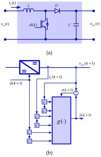 The identification framework of the boost converter, based on Equation (1), is depicted in Figure 2b. In this series-parallel identification framework, symbol q−1 realizes unit delay.
