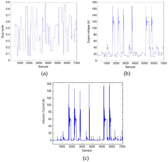 (a) The APRBS signal (duty cycle) for identification of boost converter; (b) waveform of converter output voltage obtained by applying the APRBS signal; and (c) waveform of inductor current obtained by applying the APRBS signal.
