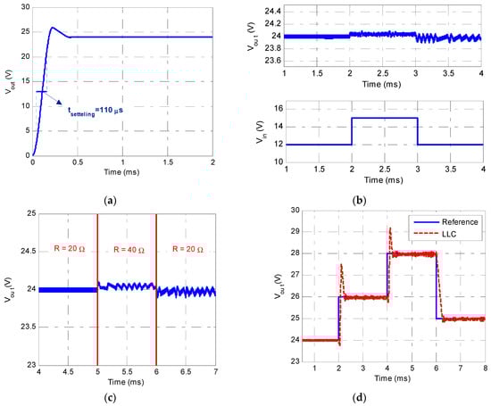 For more investigation of the proposed LLC, its performance in reference to output voltage tracking was analyzed. Figure 6d shows the LLC performance is tracking various reference voltages including 24 V, 26 V, 28 V and 25 V. Interestingly, the proposed control approach quickly followed variations in reference voltage.