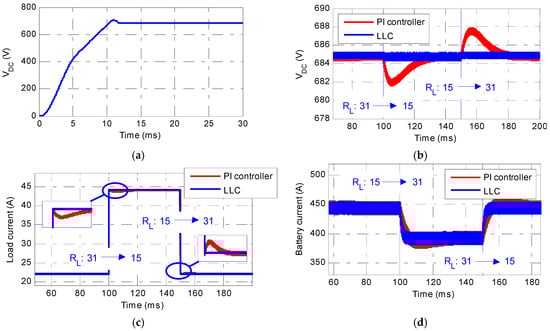 The load variation scenario included load changing from 31 Ω to 15 Ω and back again. The performance of the PI controller and LLC against the load variation is depicted in Figure 9b. As can be seen, the LLC showed outstanding performance.