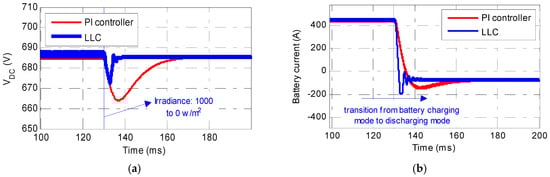 The profile of the battery current in Figure 10b shows the charge to discharge mode transition, due to the absence of PV generation. It is clear that the achieved results by the LLC reached the steady-state more quickly than the PI controller.